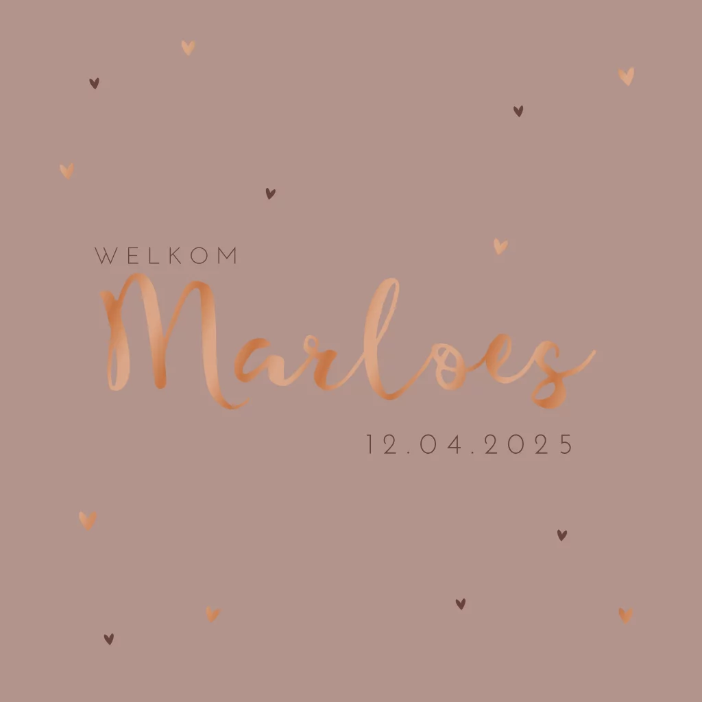 Schattige geboortekaart met romantische hartje in hoogglans op een achtergrond in trendkleur mild plum. Liever een andere achtergrondkleur of kleur hoogglans? Pas het eenvoudig aan in de online editor!