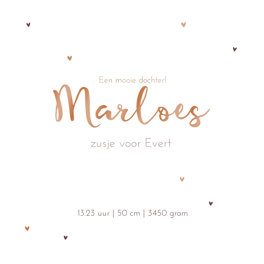 Romantisch hoogglans geboortekaartje voor meisje met lieve hartjes