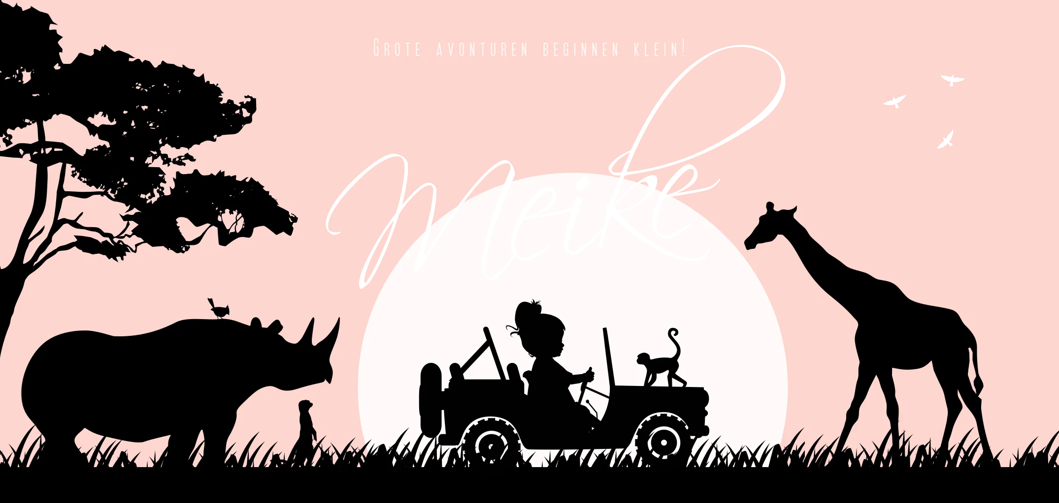 Stoer meisjes geboortekaartje met roségoudfolie voor de geboorteaankondiging van je dochtertje. Met een hip silhouet van een meisje in een jeep op safari in de jungle met dieren zoals een neushoorn, aapje, stokstaartje en giraffe bij maanlicht.
