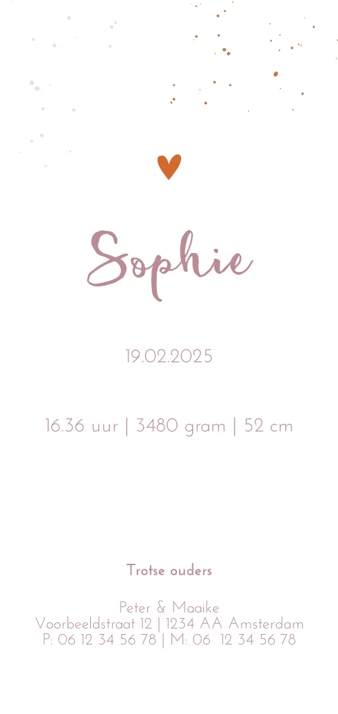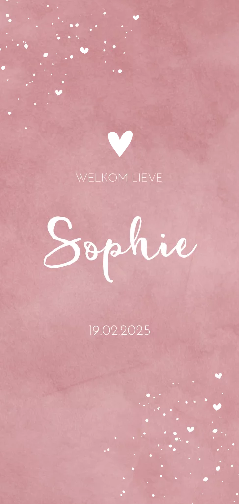 Hip babykaartje voor jullie dochtertje met lief rosegoudfolie hartje op een roze velvet-look achtergrond. Deze trendy roze achtergrond geeft dit kaartje een extra stoere uitstraling. Bewerk dit kaartje naar jullie eigen wensen in de online editor.