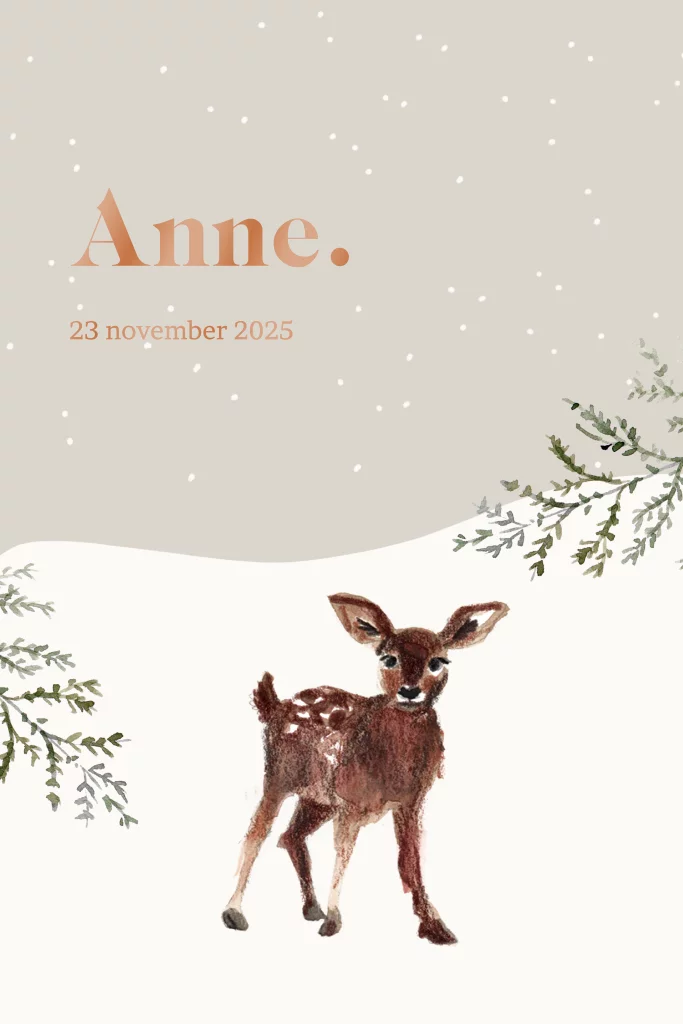 Lief geboortekaartje met de tekening van een klein hertje in de sneeuw. Aan de zijkant van het kaartje staan groene takjes en bladeren. In de lucht dwarrelen kleine witte sneeuwvlokjes.