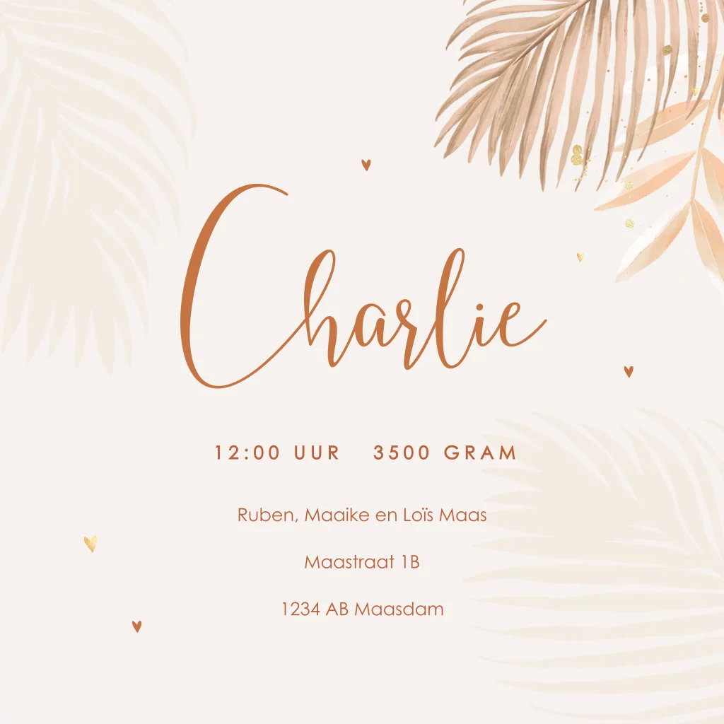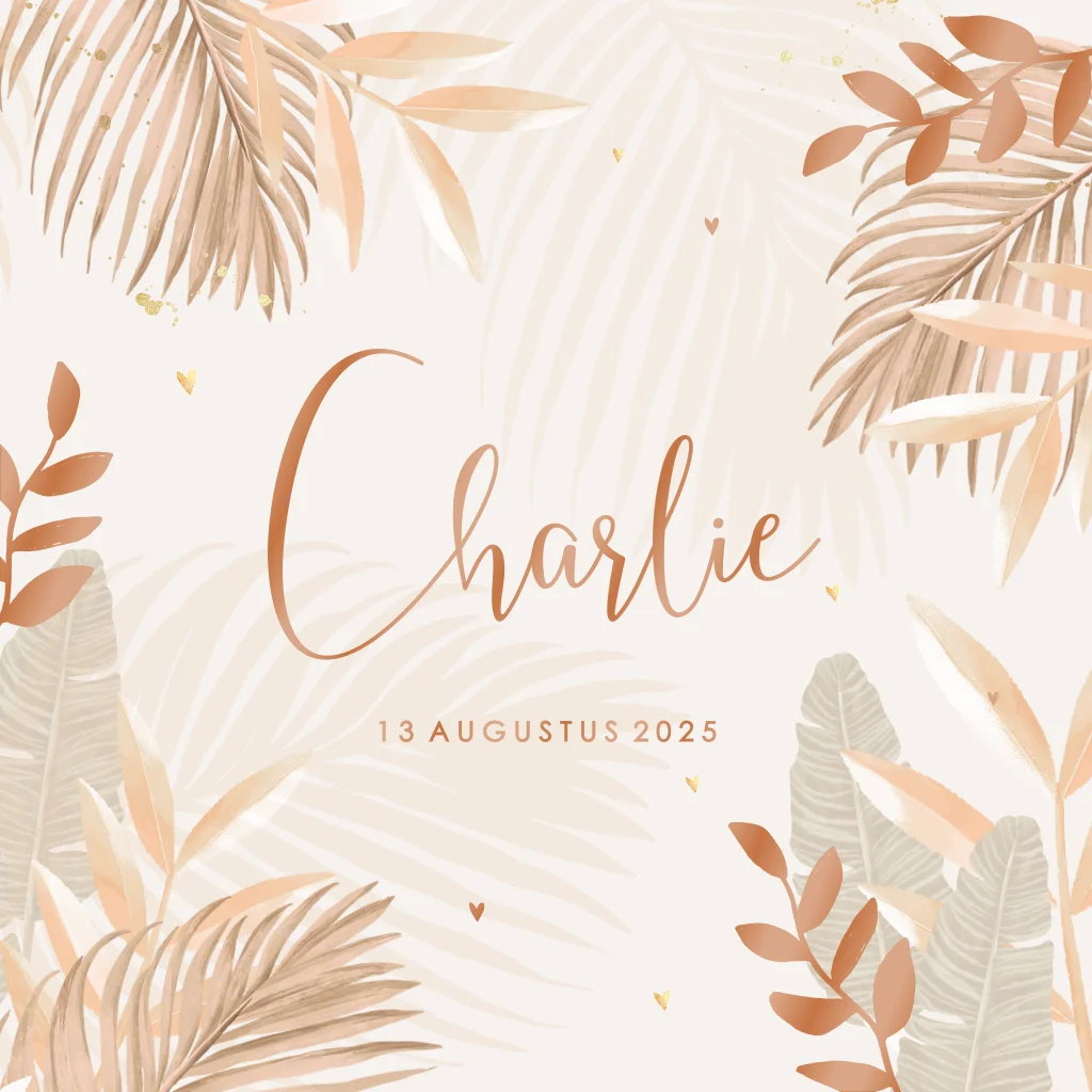 Een hip botanisch babykaartje om de geboorte van jullie kindje mee te verkondigen aan vrienden en familie. Leuk voor zowel een jongetje als een meisje. De achtergrond heeft een mooie beige kleur en de bladeren hebben verschillende natuurlijke tinten. De naam in het hoogglans zorgt voor een luxe uitstraling.