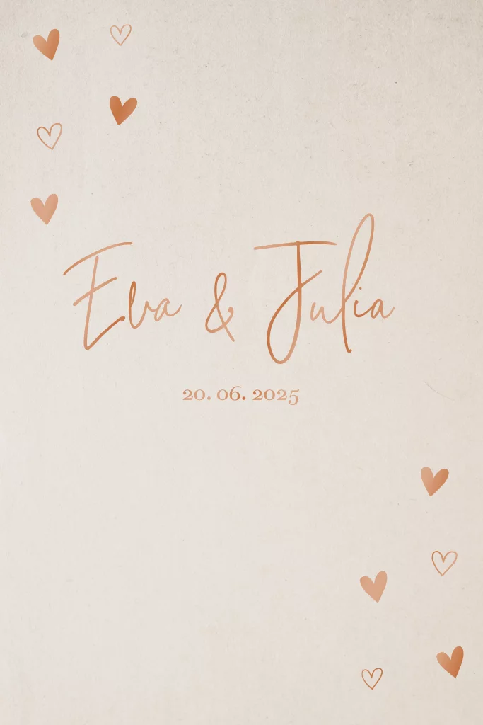 Lief hoogglans geboortekaartje voor je pasgeboren tweeling dochtertjes met lieve hartjes in hoogglans op een kartonlook achtergrond.