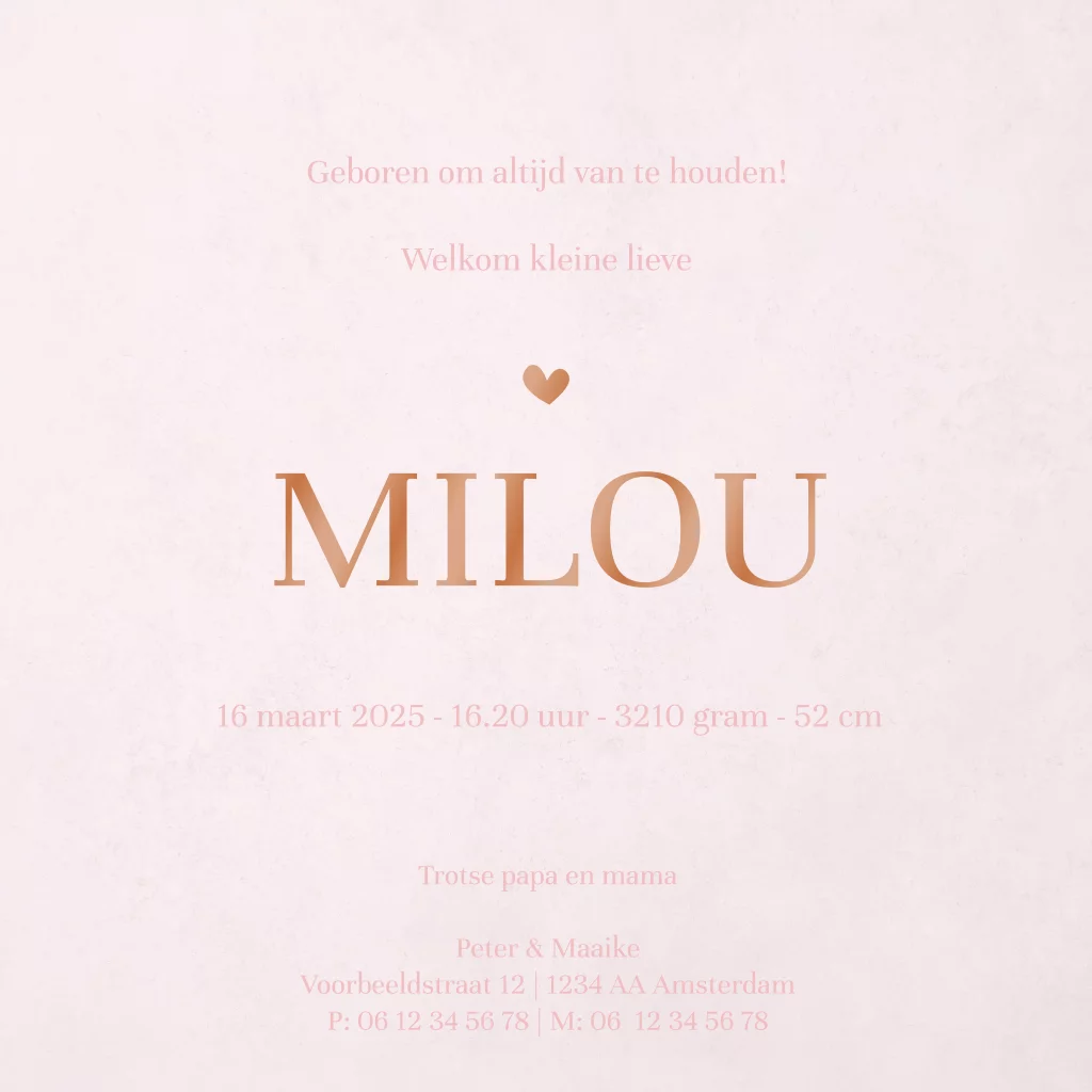 Een lief hoogglans geboortekaartje voor je pasgeboren dochter met de naam in hoogglans gedrukt. Maak het kaartje echt persoonlijk door de naam en het lettertype te veranderen, zo is het kaartje helemaal klaar voor jullie meisje.