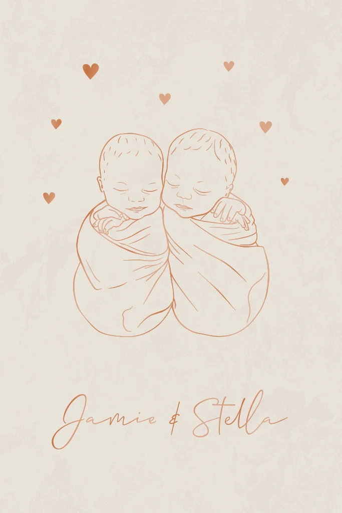 Schattig unisex geboortekaartje voor een tweeling. Op het kaartje zie je een mooie lijntekening van twee baby's. De lijntekening wordt omringt door hartjes. De lijntekening, de hartjes en de naam zijn allemaal gedrukt in glanzend hoogglans.