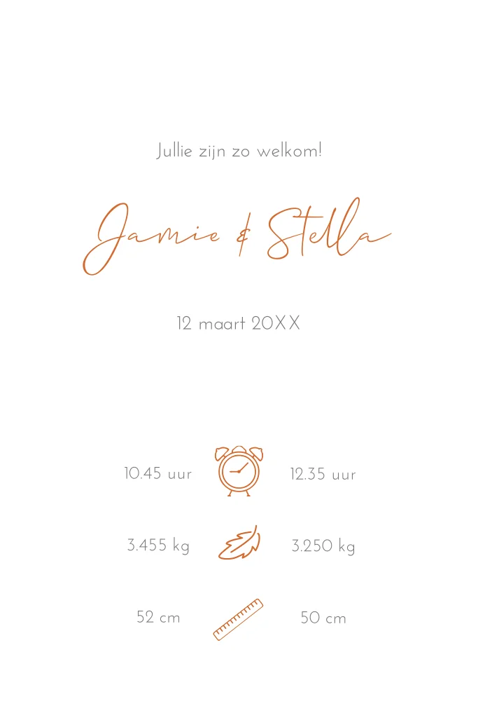 Hoogglans tweeling geboortekaartje met lijntekening en hartjes