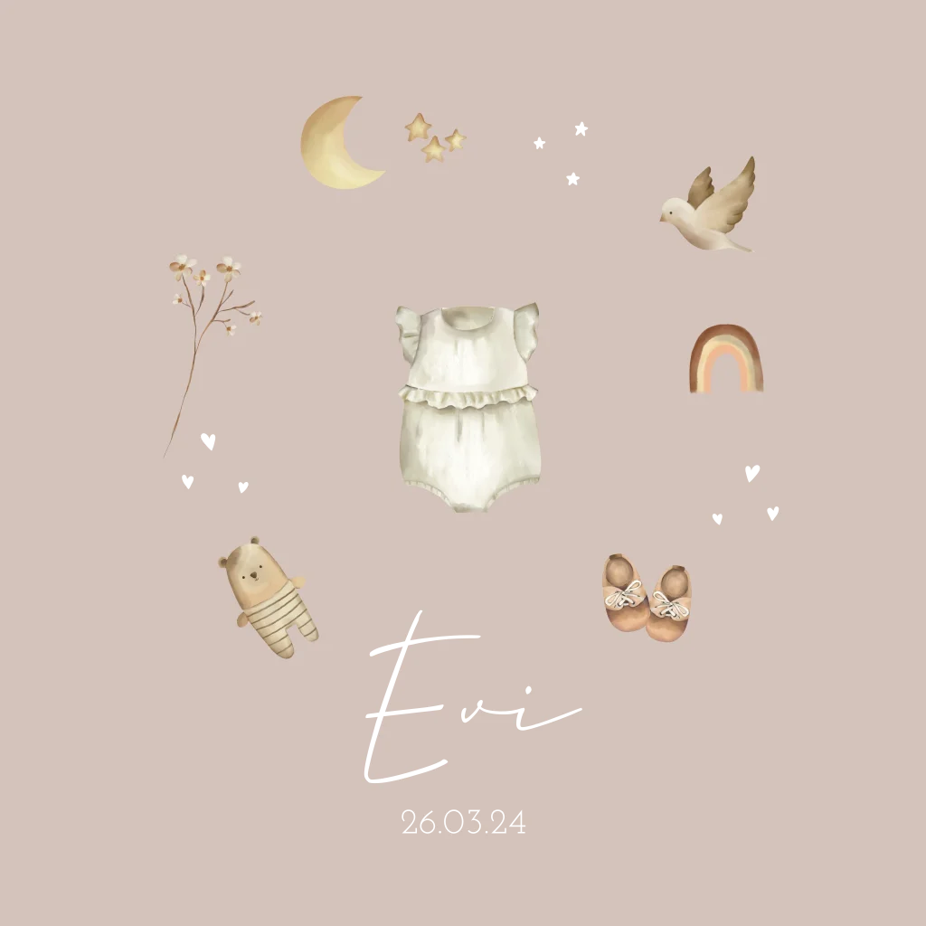 Een lief geboortekaartje voor een dochter met daarop schattige baby illustraties op een roze achtergrond. De naam van jullie kleintje wordt in roségoudfolie gedrukt. Op het kaartje zie je een rommertje, regenboogje, schoentjes, een vogeltje, bloementjes en de maan met sterretjes. In editor kan het kaartje aangepast worden naar jullie persoonlijke wensen!