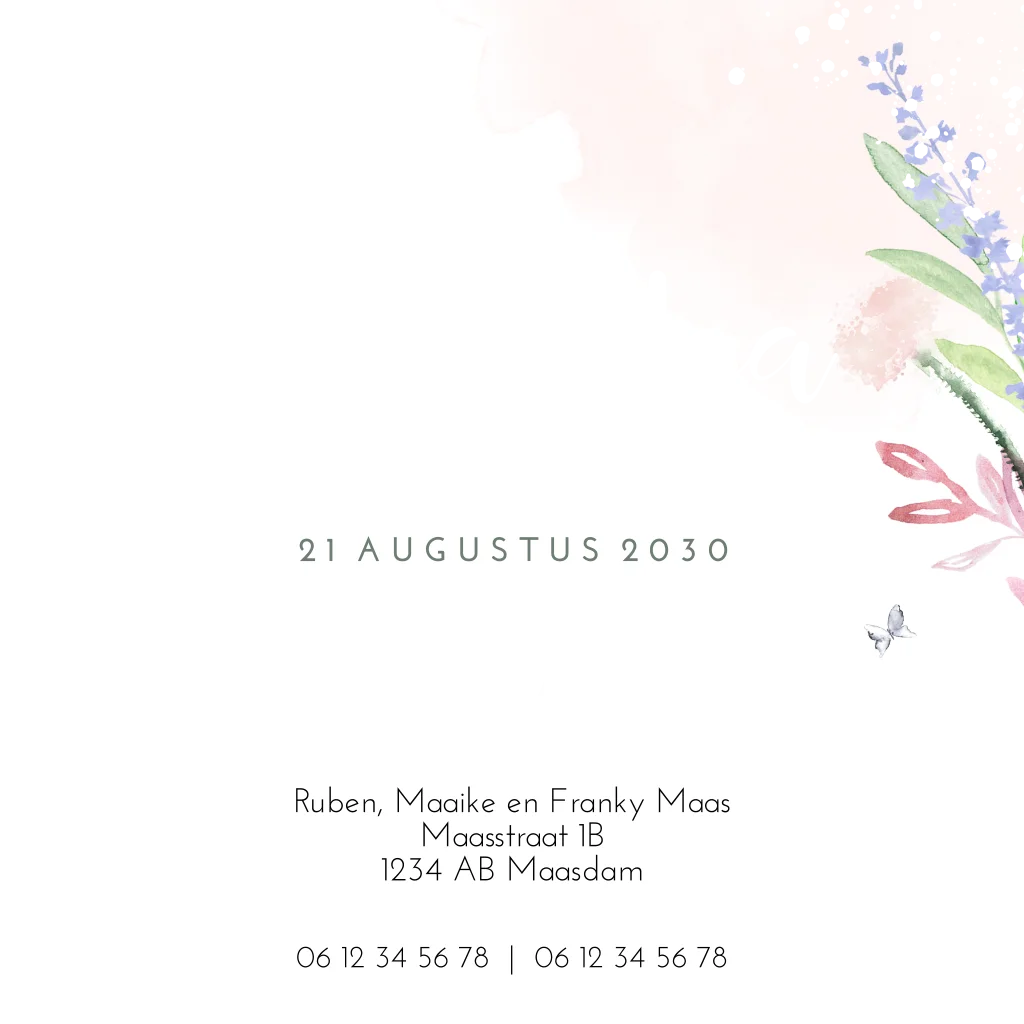 Een lief watercolour geboortekaartje met bloementjes. De naam, hartje en datum op de voorkant zijn in roségoudfolie gedrukt. Aan de binnenkant zijn ook roségoudfolie details. Personaliseer dit kaartje in onze editor.