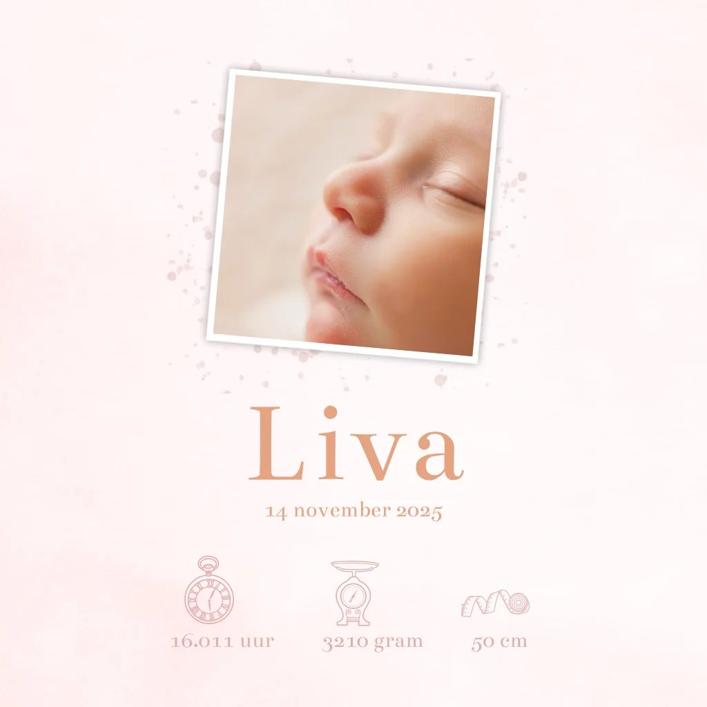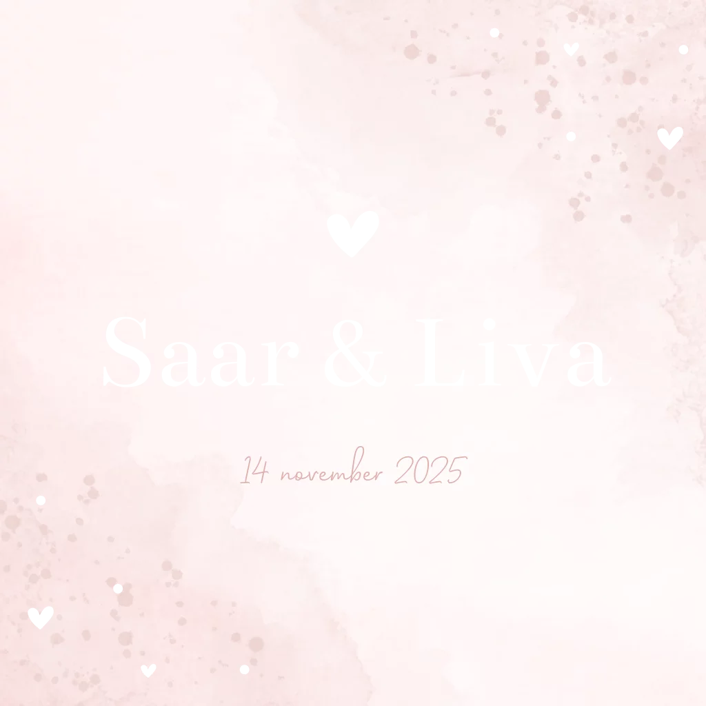 Een lief kaartje om de geboorte van jullie tweeling mee te verkondigen. De achtergrond heeft lichtroze waterverf. De namen van de kleintjes staan gedrukt in echt roségoudfolie in het midden. Ook zijn er lieve hartjes toegevoegd.