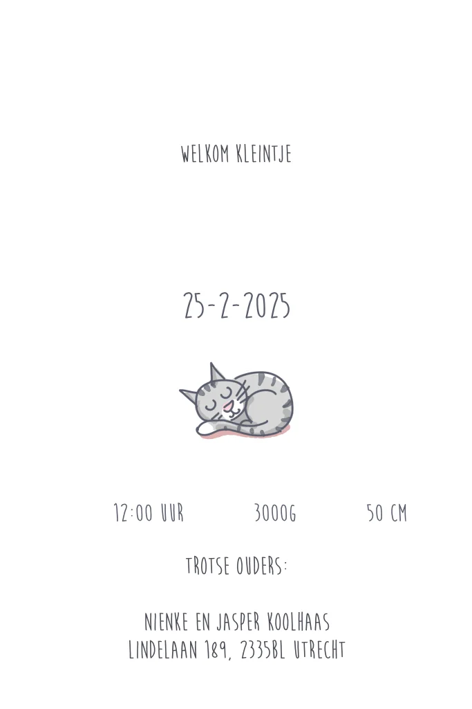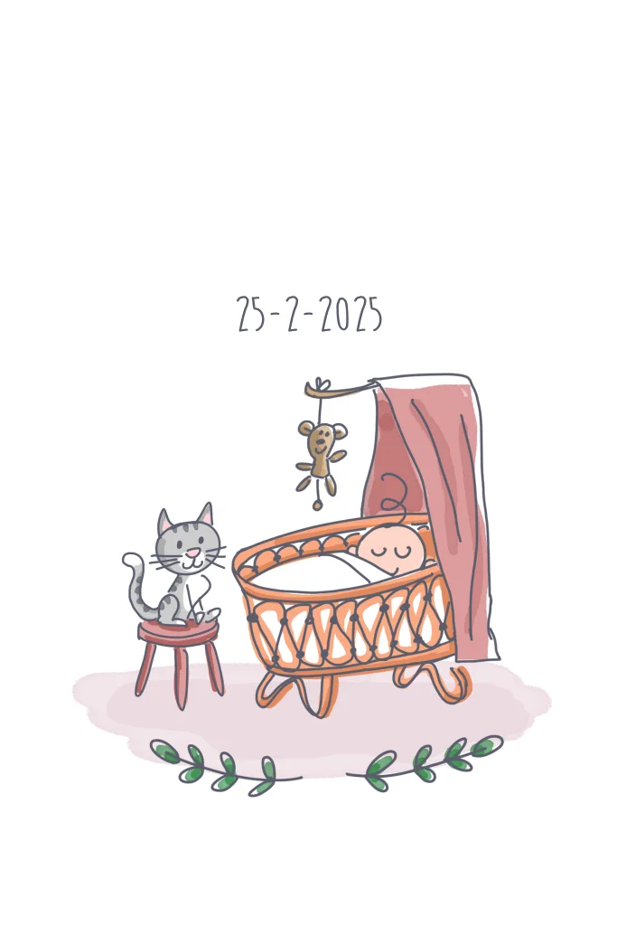 Wat een schattig tafereeltje! Deze poes zit op een krukje naast deze hippe vintage rotan wieg waarin een baby ligt te slapen. Boven de wieg hangt een muziekdoos in de vorm van een beer. Het vloerkleedje is in kleur aan te passen. Binnenin ligt het poesje te slapen. Met de naam in prachtig roségoudfolie.