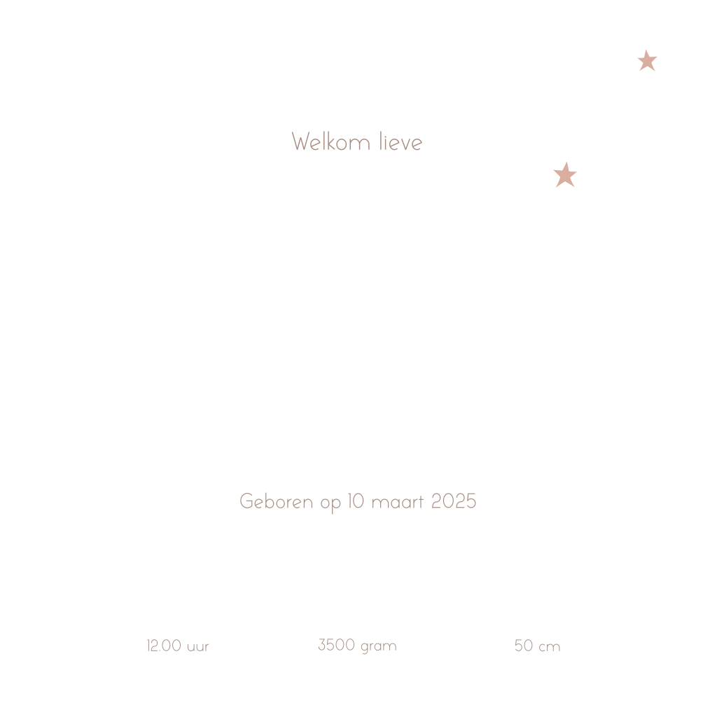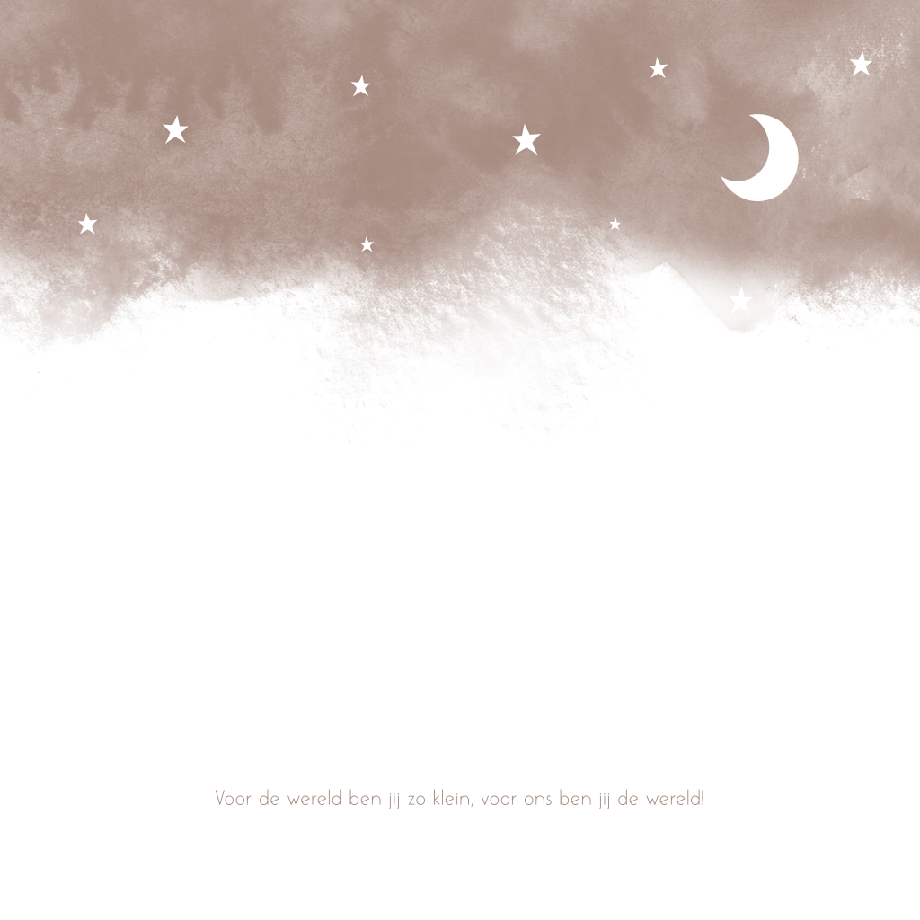 Een lief geboortekaartje voor een meisje met een trendy sterrenhemel op een bruine watercolour achtergrond. De sterren, het maantje en tekst staan in roségoudfolie.