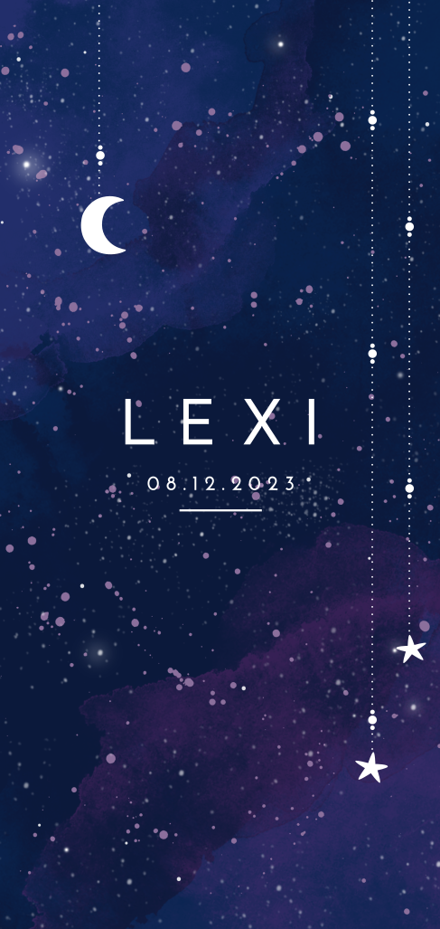 Een trendy geboortekaartje met een donkerblauwe en paarse sterrenhemel op de achtergrond. Op de voorgrond springen de naam en de andere roségoudfolie elementen er helemaal uit. Dit zorgt voor een luxe uitstraling.