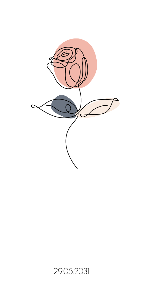 Langwerpig geboortekaartje voor jullie kleine dochtertje. Dit minimalistische ontwerp bevat een lijntekening van een roos. Hierbij zijn wat verschillende gekleurde vlakken geplaatst. De naam in het roségoudfolie is super stijlvol.