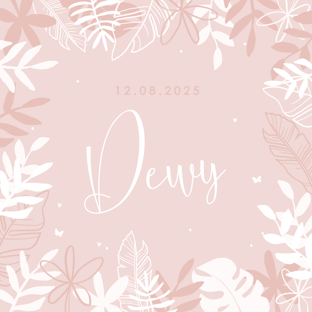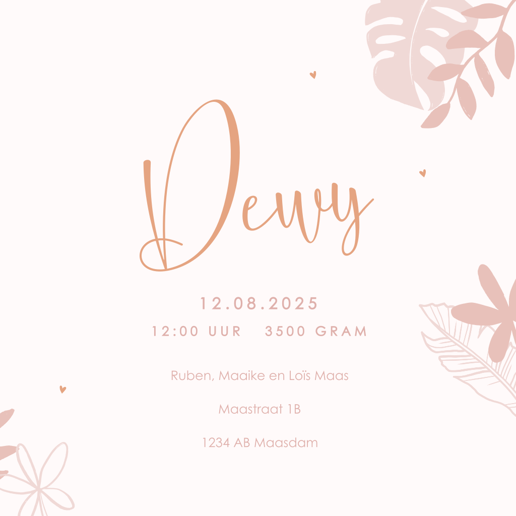 Een hip botanisch babykaartje om de geboorte van jullie dochtertje mee te verkondigen aan vrienden en familie. De achtergrond heeft een mooie oudroze kleur en de bladeren hebben verschillende tinten. De naam in het roségoudfolie zorgt voor een luxe uitstraling.