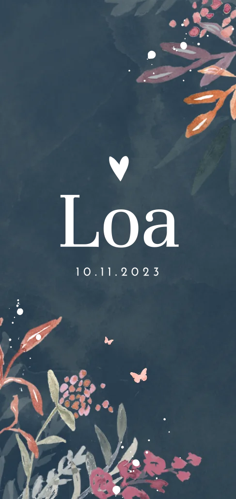 Een stijlvolle geboortekaart voor de geboorte van jullie dochtertje. De donkerblauwe achtergrond heeft een watercolour effect. Er zijn hierop wat mooie bloemen en takken te zien. In het midden staat de naam van jullie kindje in roségoudfolie. Dit geeft een luxe uitstraling.