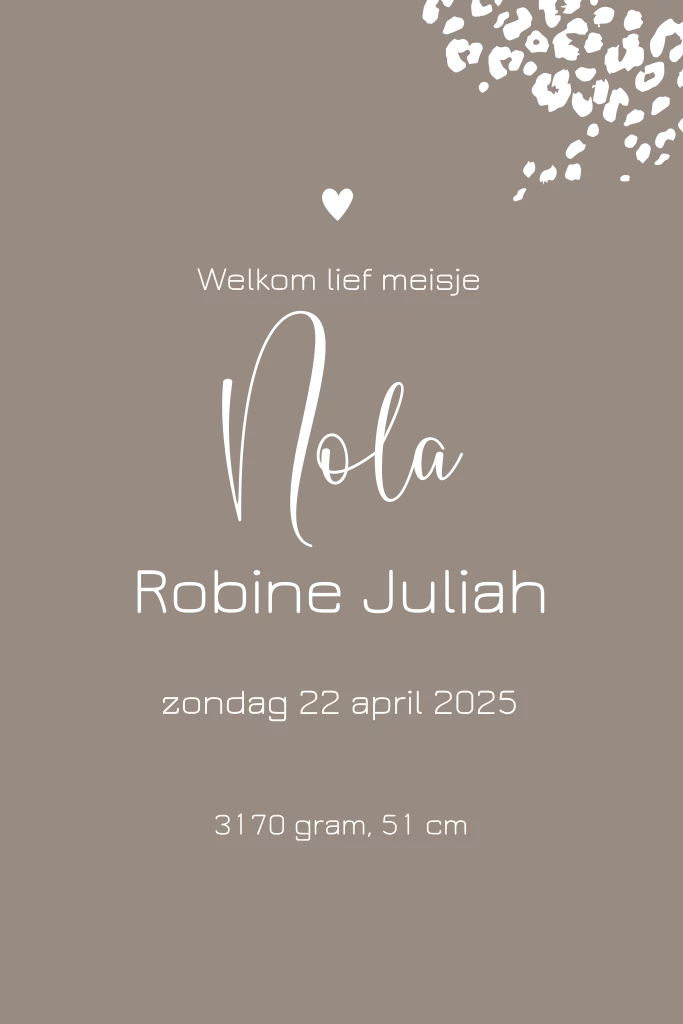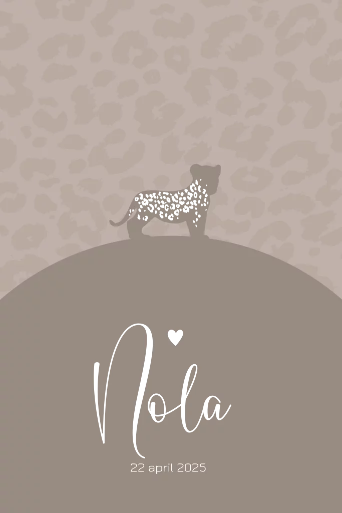 Uniek geboortekaartje voor je dochter met een silhouet van een luipaard welpje op een taupe-kleurige achtergrond. De panter vlekjes worden in roségoudfolie gedrukt en maakt dit echt een chique geboortekaartje!