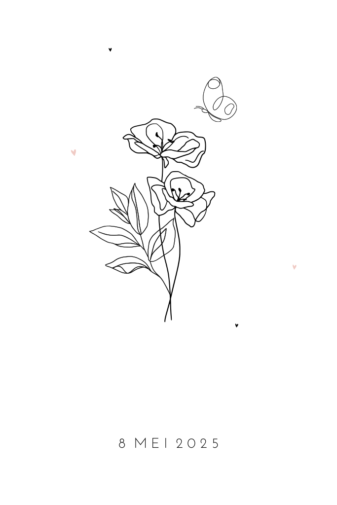 Trendy geboortekaartje voor je dochtertje met een hippe lijntekening van bloemetjes en een vlindertje. De babynaam in roségoudfolie maakt dit geboortekaartje helemaal af!