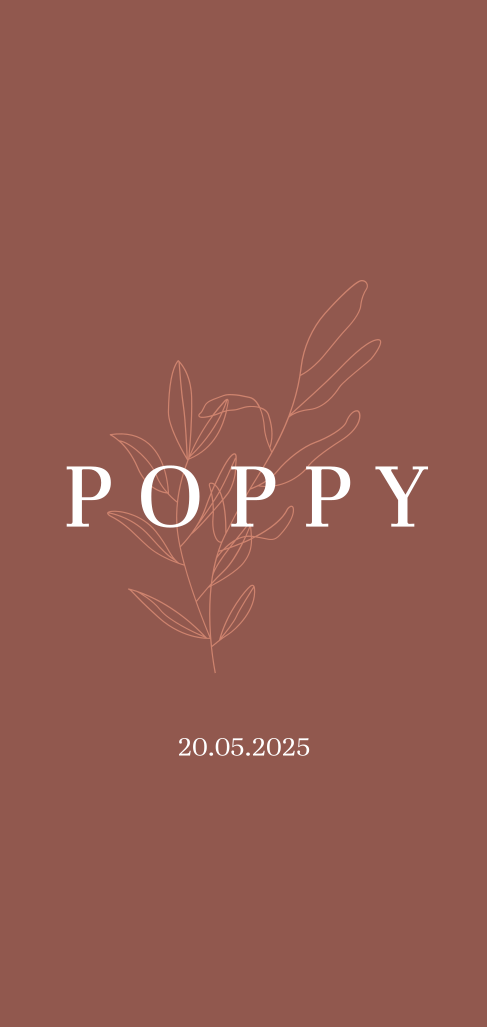 Trendy babykaartje met de lijntekening van een takje met bladeren op een terracotta achtergrond. De naam van je dochter wordt gedrukt in roségoudfolie en maakt dit kaartje extra bijzonder!