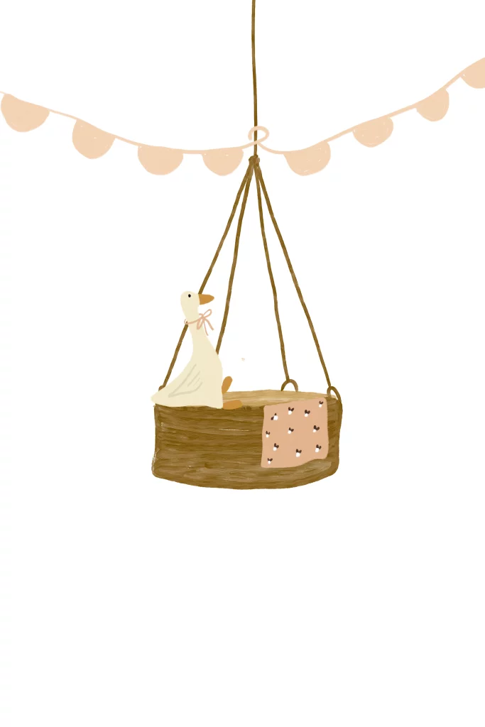 Babykaartje met de illustratie van een gans in een mandje. De roze slingers en letters in roségoudfolie maken dit een feestelijk kaartje.