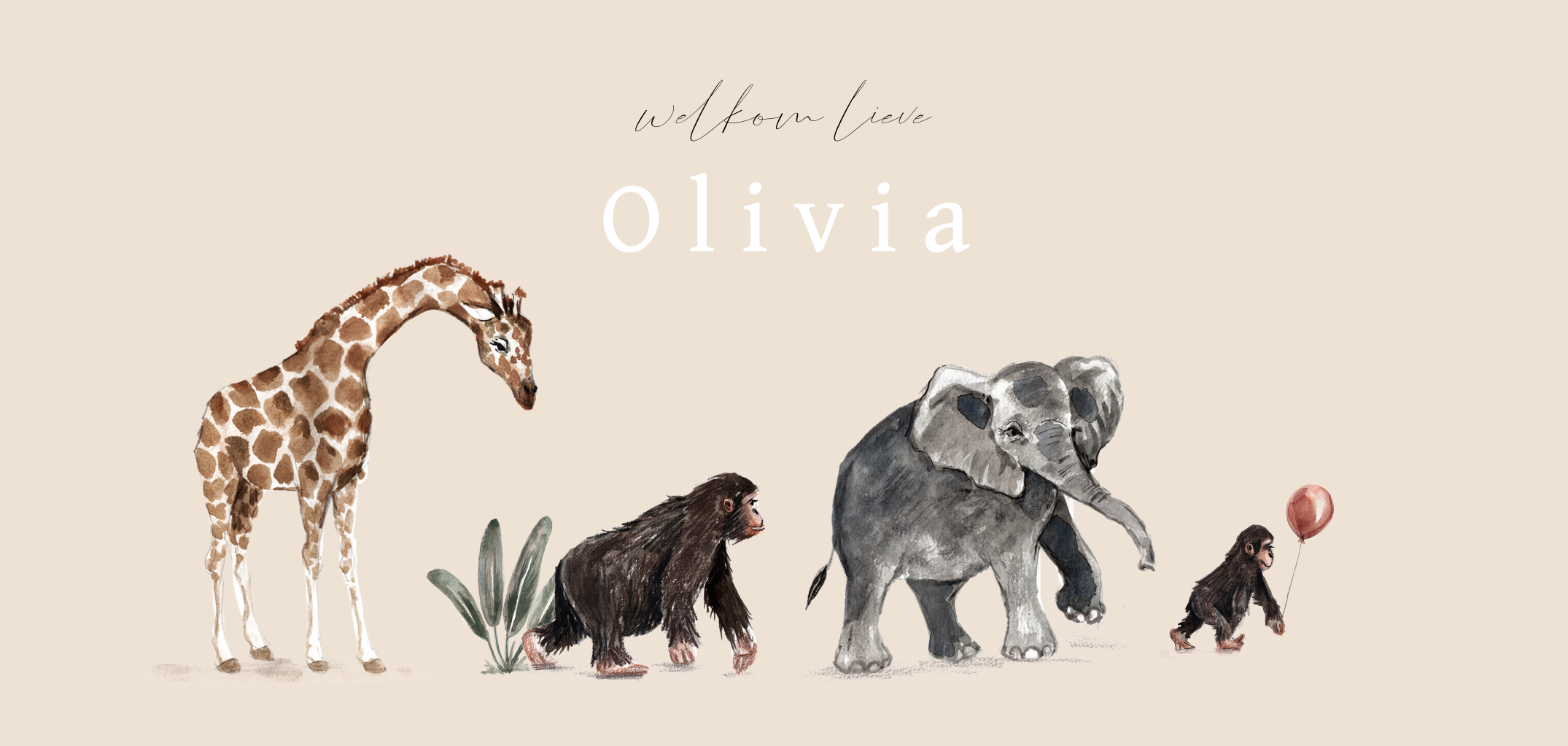 Vrolijk babykaartje in een jungle thema met lieve diertjes in een optocht. Een giraffe, olifant, aap en klein aapje met een roze ballon. De naam van jullie dochter wordt gedrukt in roségoudfolie.