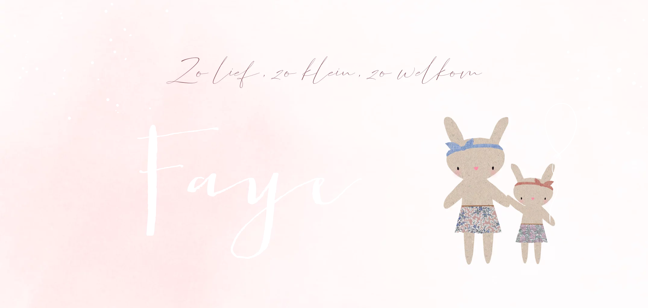 Dit schattige babykaartje met twee konijnen zusjes is perfect voor een tweede meisje. Het kaartje is extra mooi door de folie accenten zoals de ballon en verfspatten en de subtiele roze watercolour achtergrond. Pas de teksten en eventueel foliekleur aan in de online editor.