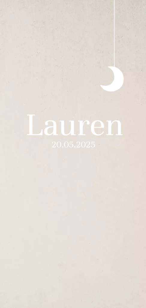 Minimalistisch geboortekaartje voor je dochter die helemaal past in de natuurlijke trend! Met een hippe maan (en de naam) in roségoudfolie op een natuur karton-look achtergrond.