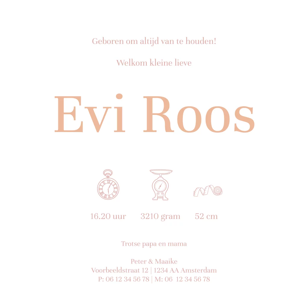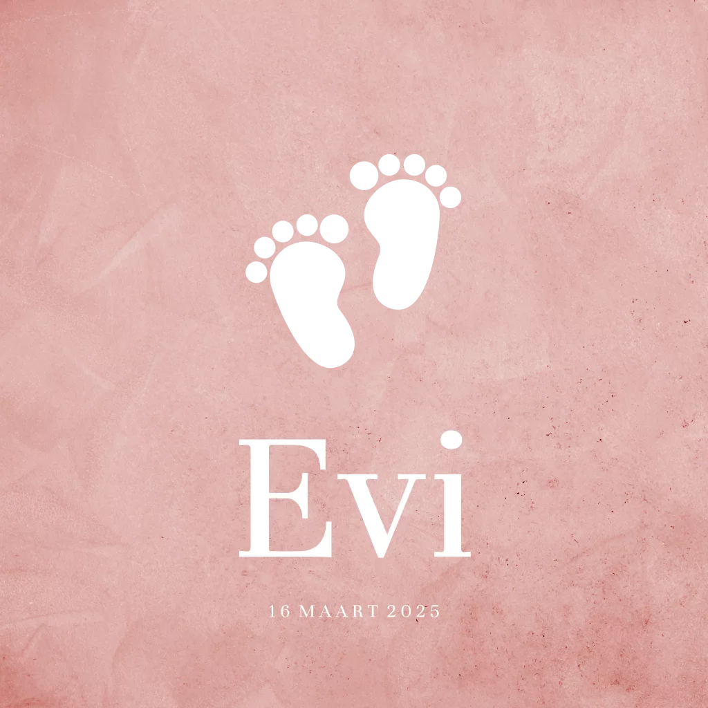 Lief babykaartje met de afdrukken van twee babyvoetjes op een roze achtergrond. De voetjes en naam aan de binnenkant worden in rosékleur gedrukt. Je kunt er voor kiezen om ook aan de binnenzijde foliedruk toe te passen om het een extra bijzonder kaartje te maken.