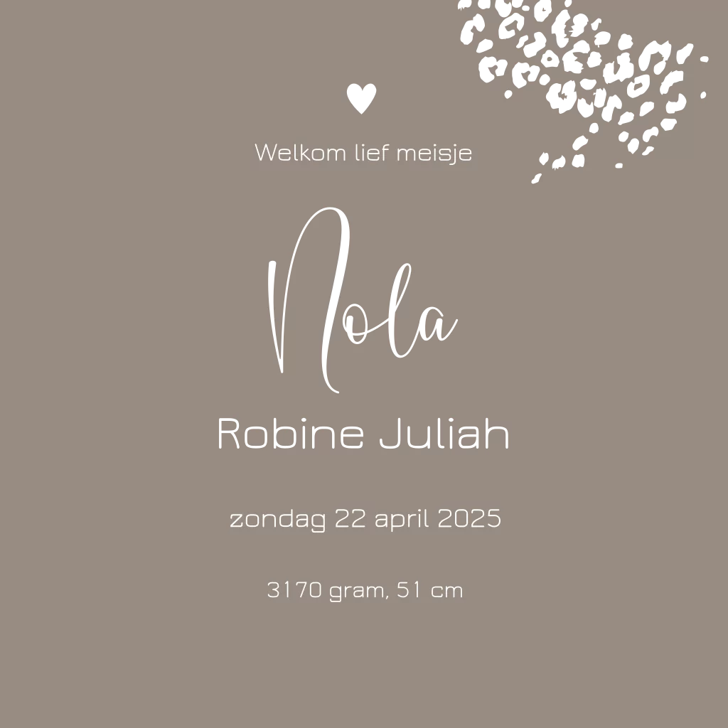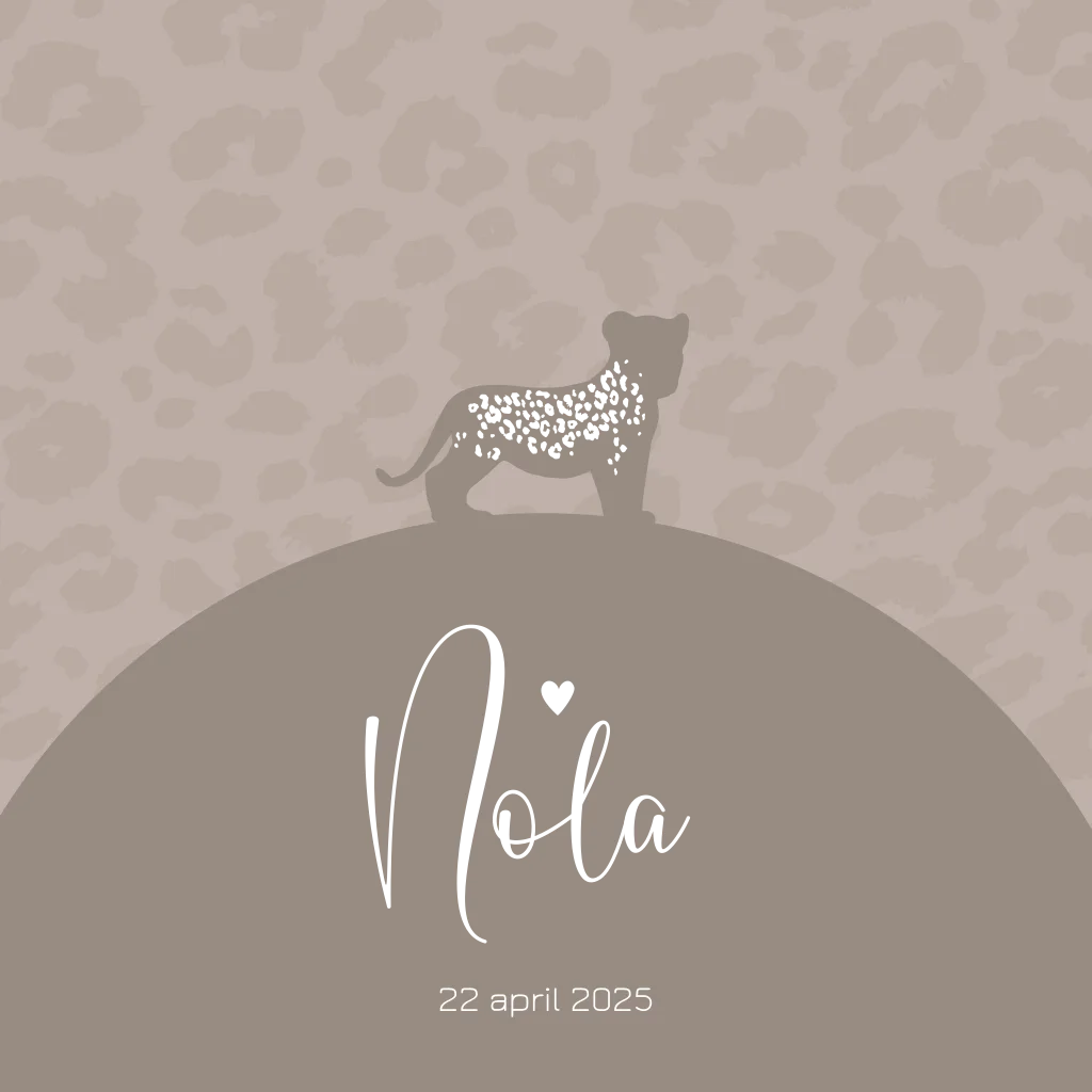 Schattig geboortekaartje met het silhouet van een panter welpje op een taupe-kleurige achtergrond. De panter vlekjes en naam worden in roségoudfolie gedrukt en maken dit echt een chique kaartje!