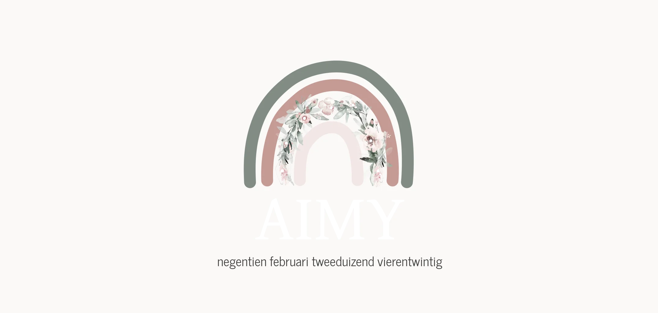 Trendy babykaartje met regenboogje. In de regenboog op de voorkant van het kaartje is 1 van de banen een slinger met bloemetjes, takjes en kleine stipjes roségoudfolie.
