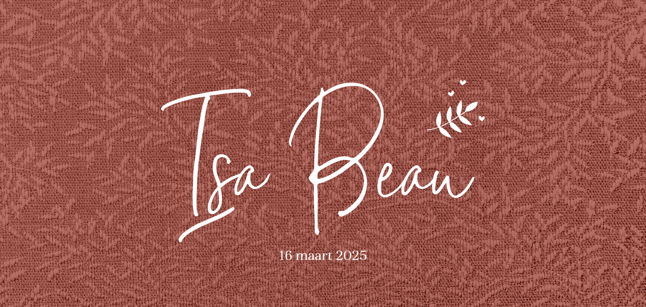 Kondig de geboorte van jullie dochtertje aan met dit luxe kaartje! Het kaartje heeft een donkerrode achtergrond met takjespatroon en stof-look. Centraal op het kaartje worden de naam, geboortedatum en het kleine takje gedrukt in roségoudfolie. Het kaartje is naar wens aan te passen in onze online editor. Bestel snel een proefdruk om dit kaartje in het echt te bewonderen!