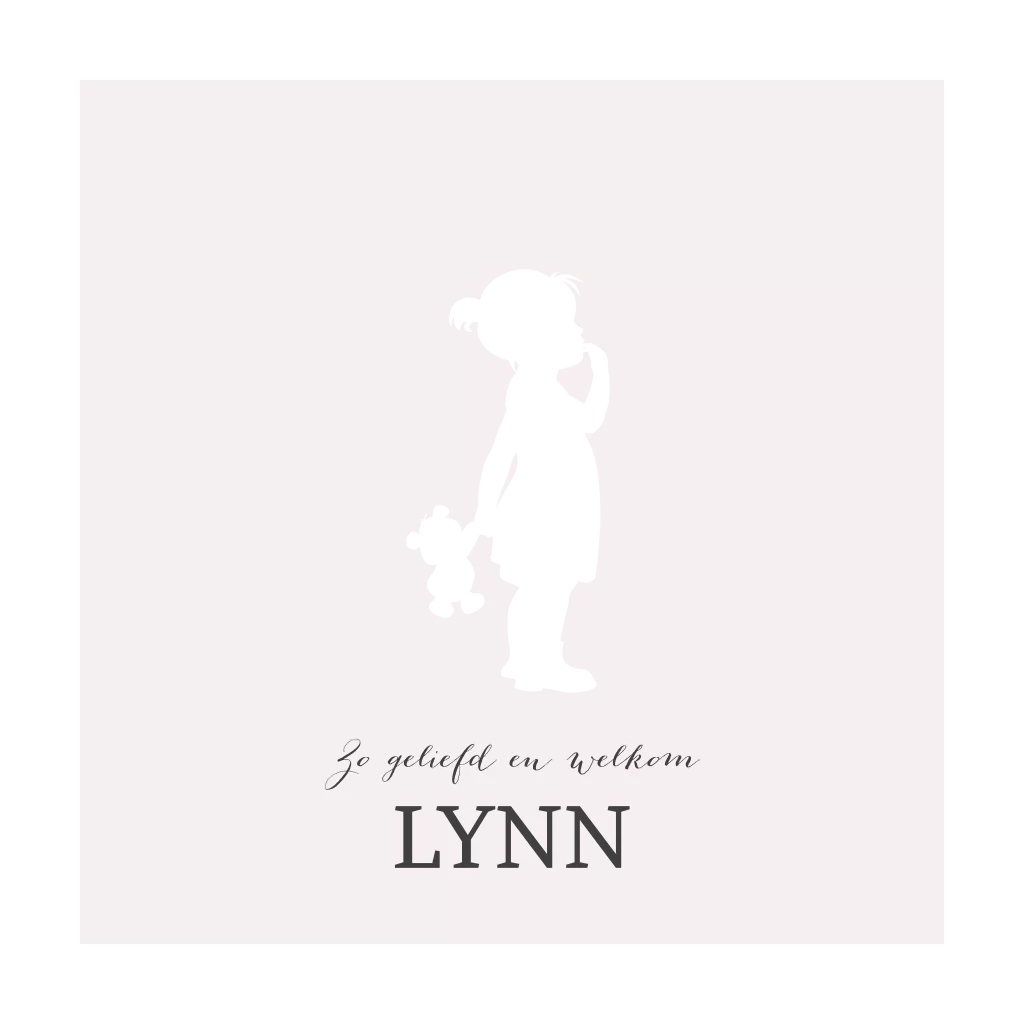 Lief babykaartje met het silhouet van een klein meisje met een duim in haar mond en knuffeltje in haar hand. Het figuurtje wordt gedrukt in roségoudfolie en staat op een lichtroze achtergrond.