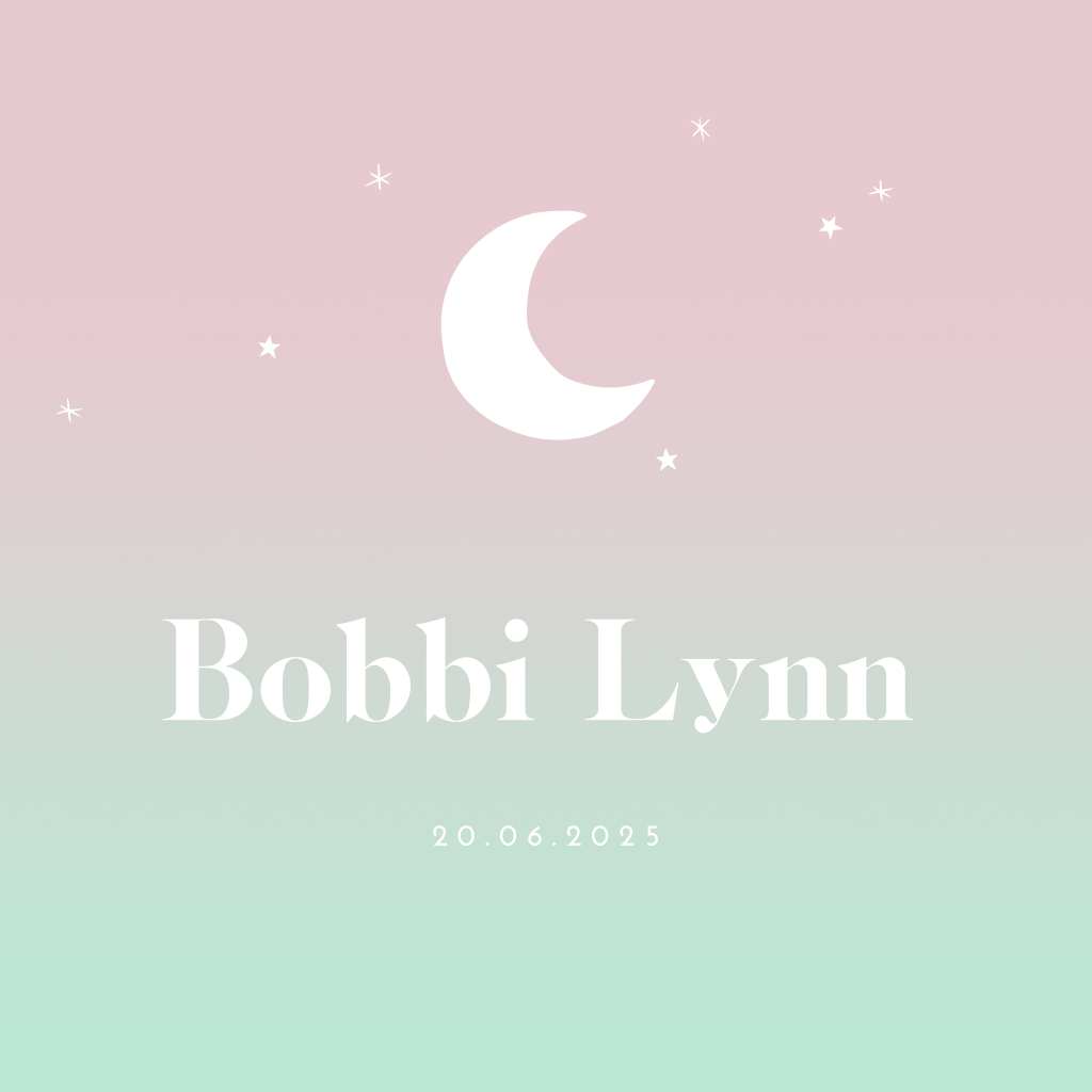 Een gaaf kaartje voor de geboorte van jullie dochtertje. Het kleurverloop op de achtergrond van roze naar mintgroen is heel origineel. De naam wordt in een strak lettertype weergegeven. Het maantje en de sterretjes in roséfolie maken het helemaal af.