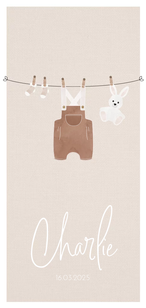 Wat een schattig geboortekaartje! Met illustratie van een waslijn waar een babypakje, kleine sokjes en een knuffel konijntje hangen. Verschillende accenten van de kleertjes worden gedrukt in roségoudfolie. De babynaam in roségoudfolie sluit mooi aan bij de natuurlijke tinten van het kaartje.