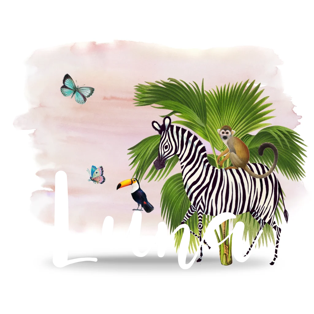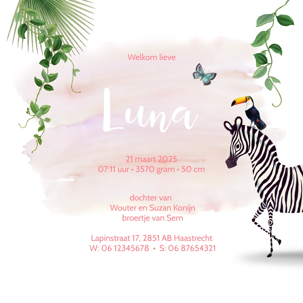 Een lief geboortekaartje met verschillende jungle dieren. De achtergrond is watercolour en de naam is in roségoudfolie gedrukt. Bewerk het kaartje in onze online editor en maak het kaartje helemaal naar wens!