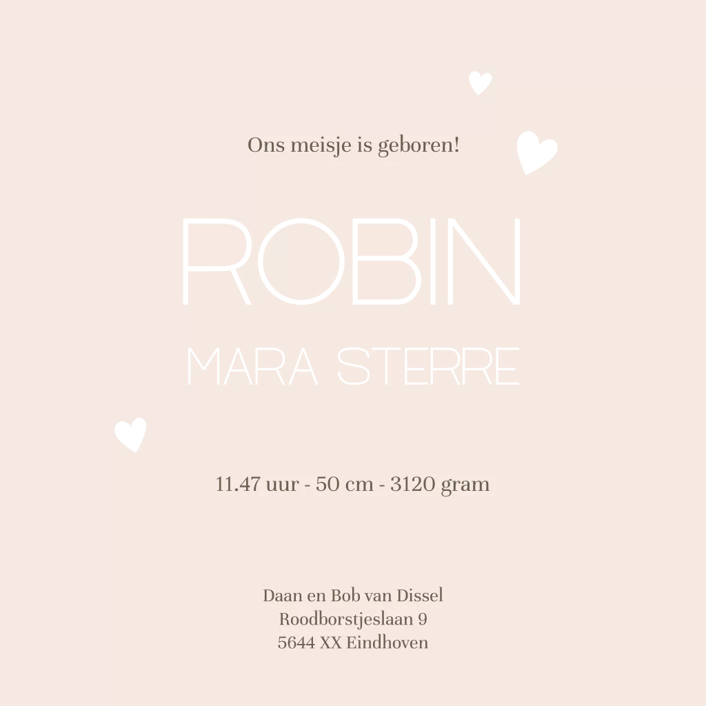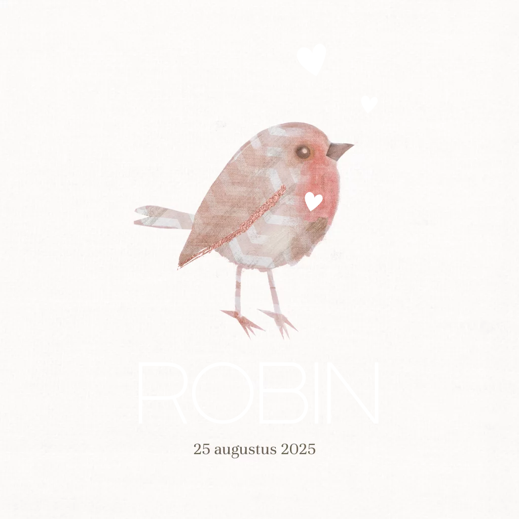 Schattig geboortekaartje voor je dochtertje in natuurlijke tinten met een roodborstje en lieve roségoudfolie hartjes.