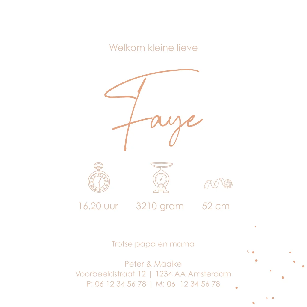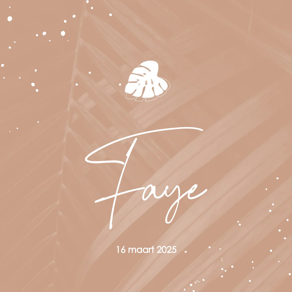 Een trendy kaartje voor de geboorte van jullie dochtertje. De achtergrond heeft een roze kleur waarop je een licht motief van jungle bladeren ziet. De naam, geboortedatum en spetters worden in roségoudfolie gedrukt.