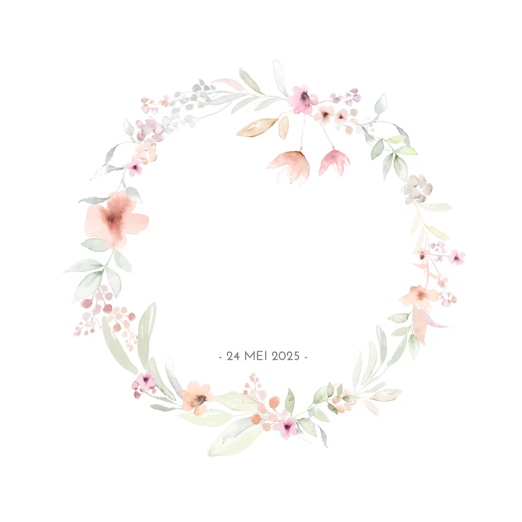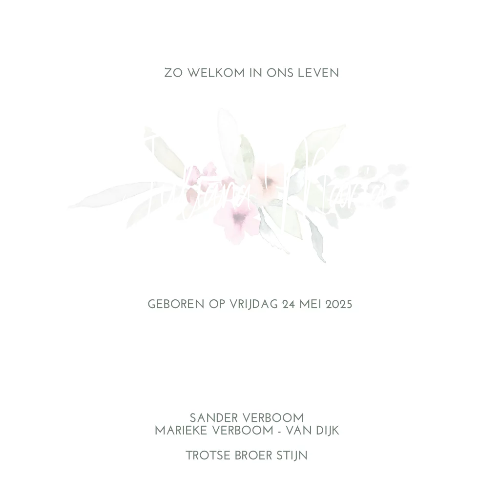 Een lief en klassiek geboortekaartje voor een meisje. De bloemenkrans op de voorkant van het kaartje heeft een mooi watercolour design. De naam is in roségoudfolie gedrukt en maakt het kaartje echt af!