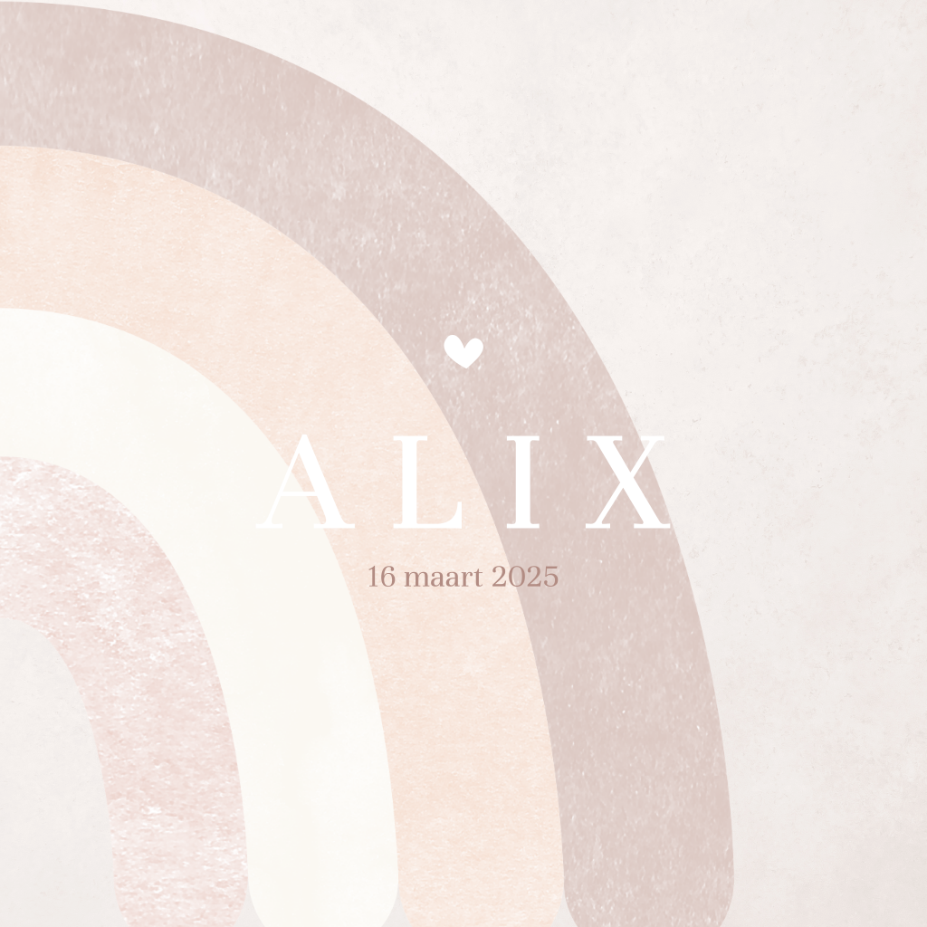 Trendy geboortekaartje met watercolour regenboog op de achtergron en naam in roségoudfolie. De aardetinten maken het echt een hip geboortekaartje.