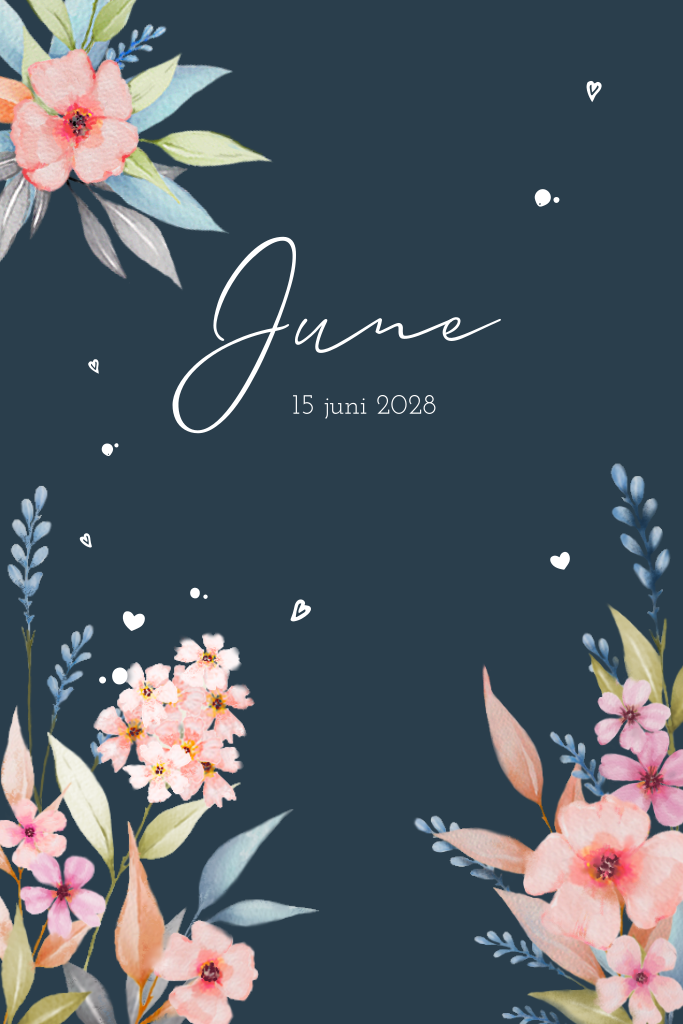Een stijlvol geboortekaartje voor een meisje. Het kaartje heeft een warme blauwe achtergrond. Op de voorgrond zie je illustraties de bloemen. Het kaartje heeft verschillende goudfolie details waaronder de naam.