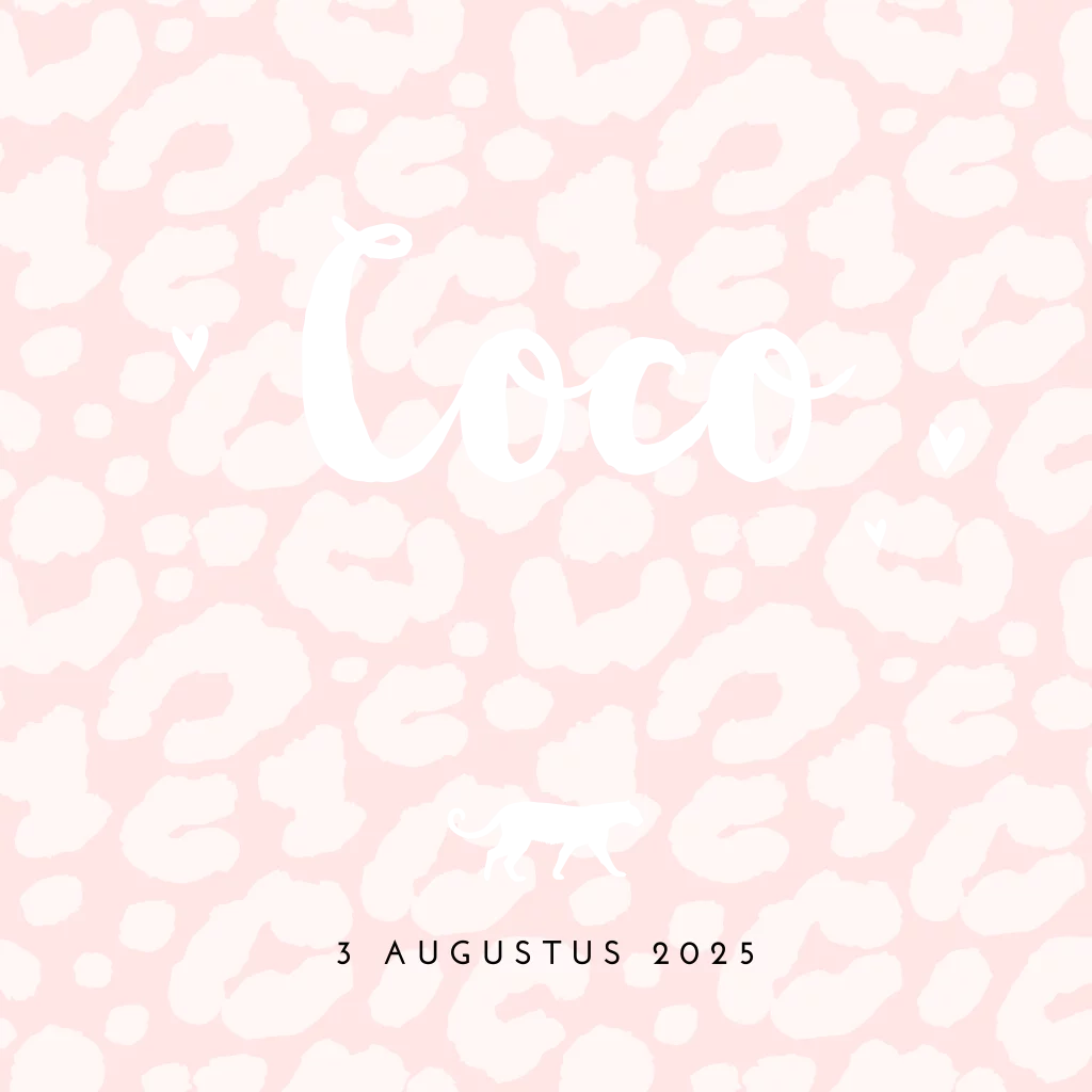 Een stoer geboortekaartje voor een meisje, met mooie details in goud folie zoals de panter, kleine hartjes en natuurlijk de naam van jullie meisje! Bewerk de kaart in de editor en maak direct een proefdruk.