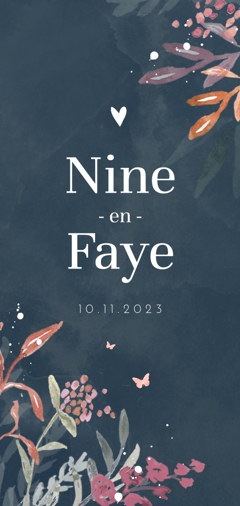 Dit prachtige geboortekaartje heeft een stoere, donkerblauwe achtergrond en fleurige bloemen. Speciaal voor een tweeling. De namen en elementjes zijn in roségoudfolie gedrukt.