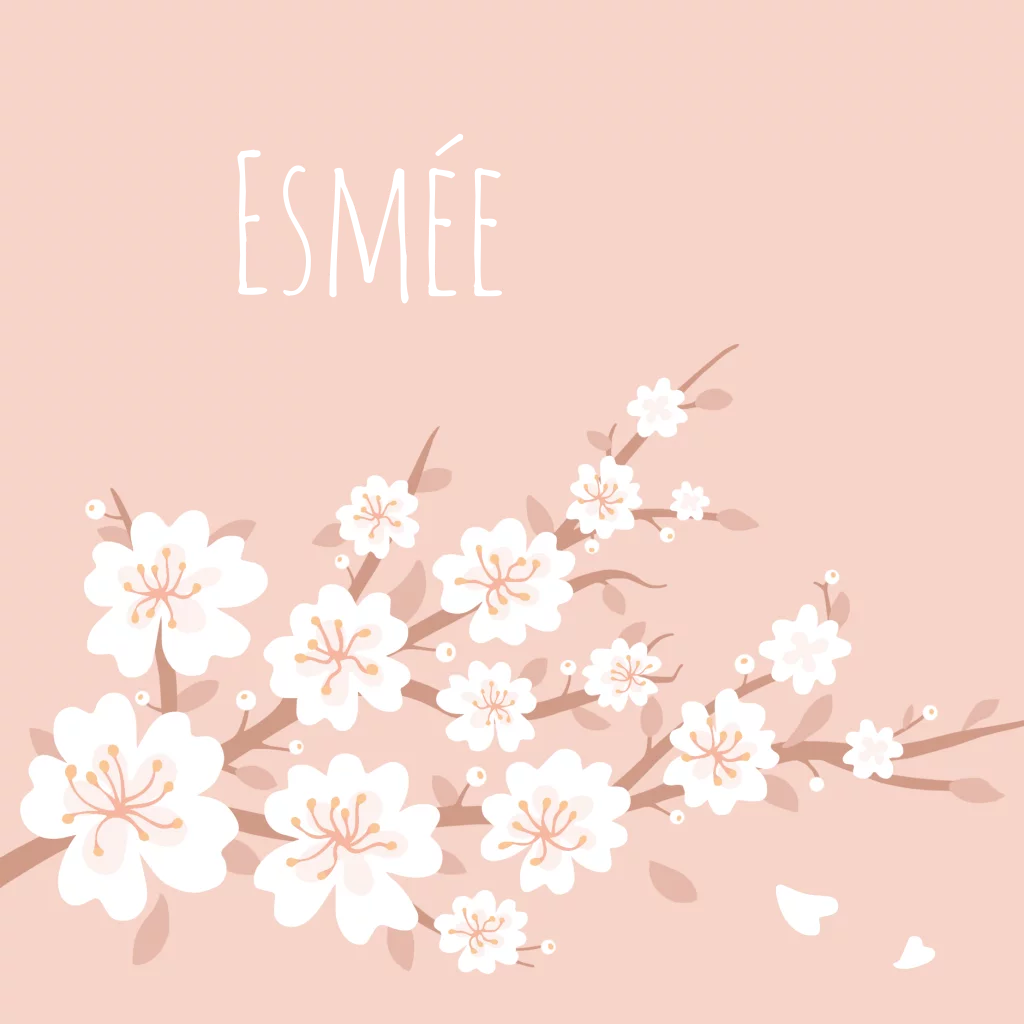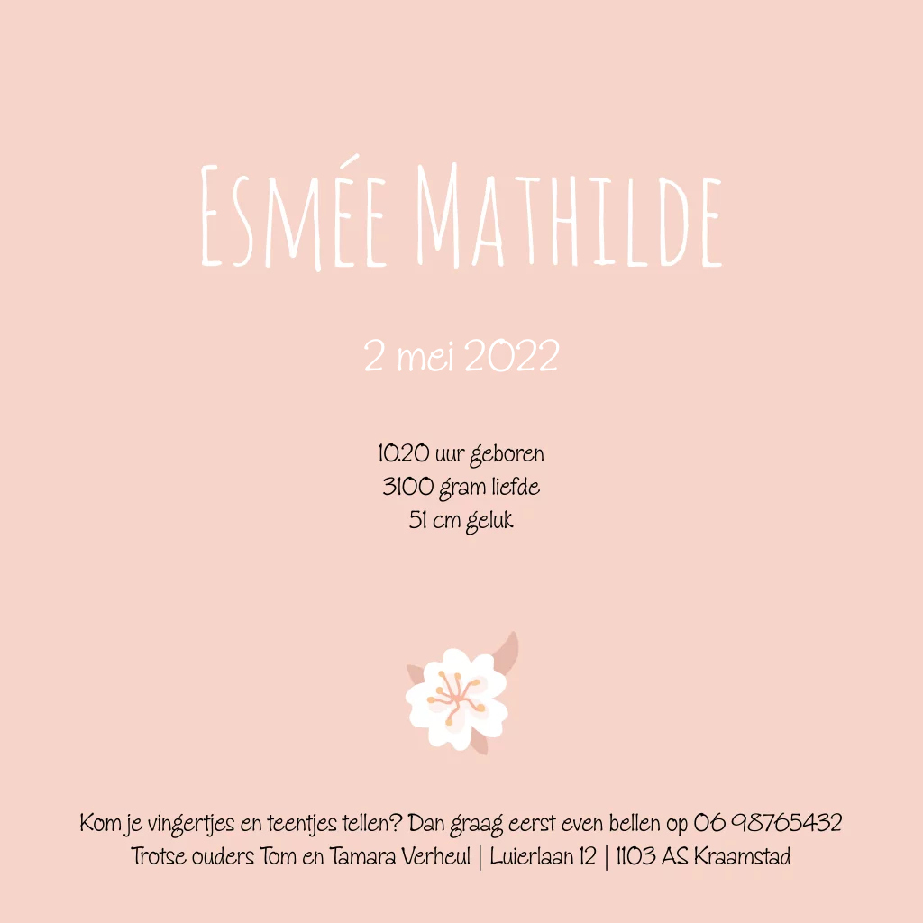 Schattig en vrolijk geboortekaartje in lente sferen voor de geboorte van je dochtertje met de babynaam in zilverfolie en lieve bloesem op roze.
