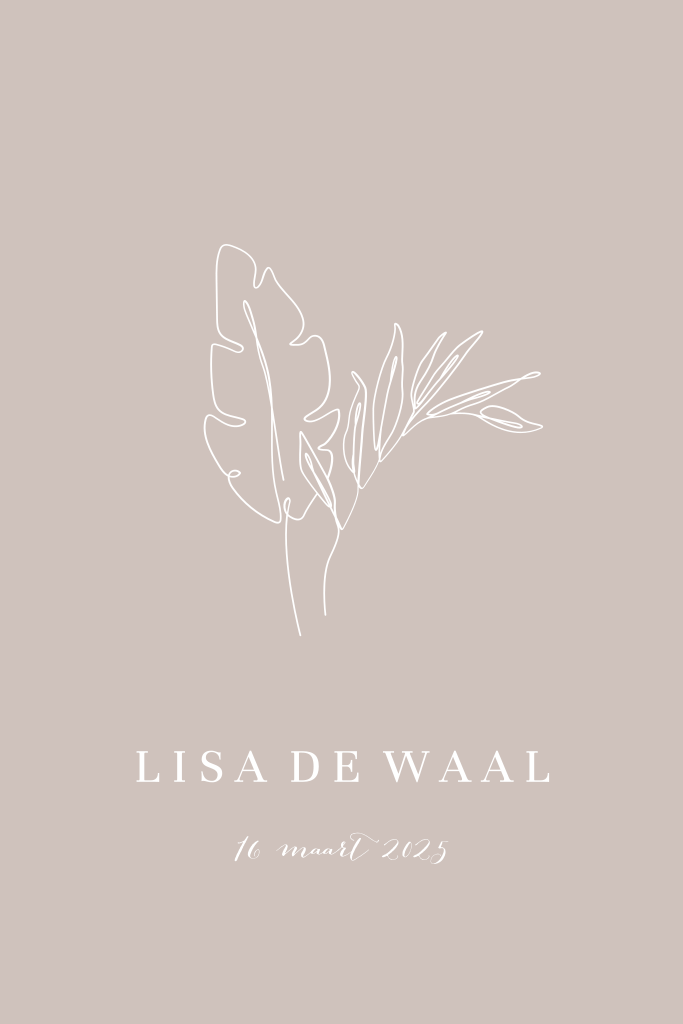 Gaaf minimalistisch geboortekaartje voor de geboorte van je dochtertje met hippe lijntekening in zwart folie van twee bladeren op een zachte natuurlijke aardetint. Liever een andere achtergrondkleur of lettertype? Pas alle elementen gemakkelijk aan in de editor.