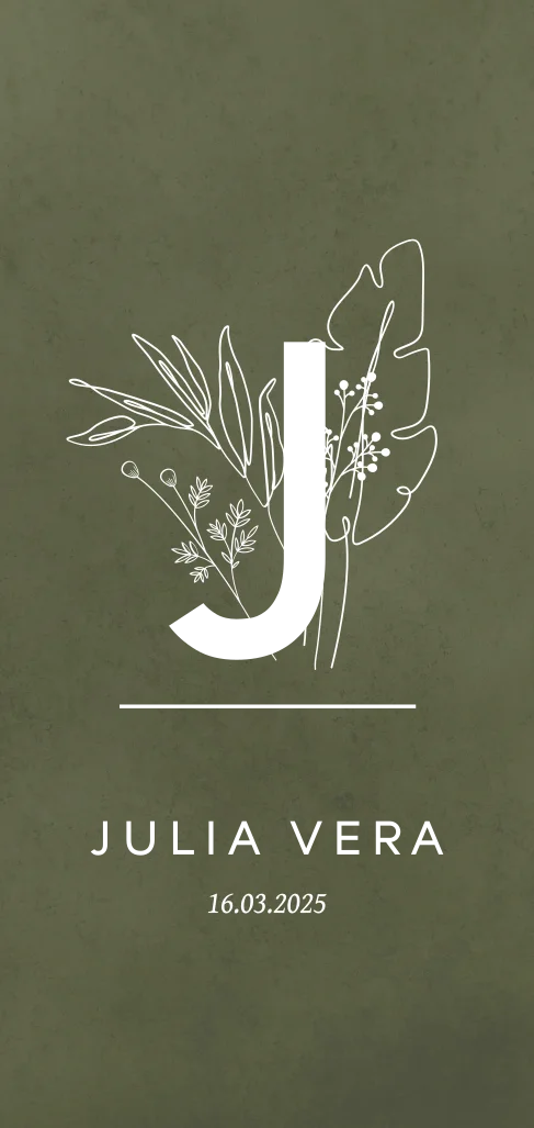 Trendy zwart folie geboortekaartje voor meisje met stijlvolle lijntekening van bladeren, takjes en bloemetjes op een donkergroene achtergrond. Toch liever een andere kleur folie? Geen zorgen, dit kun je gemakkelijk aanpassen.