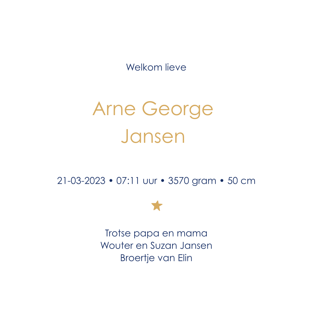 Kies zelf tussen goud-, zilver- en koperfolie. Wil je naast de babynaam en geboortedatum nog meer elementen in folie? Neem dan contact op met de klantenservice.