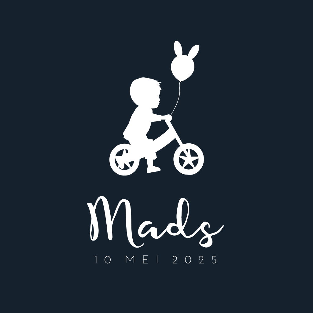 Hip geboortekaartje met het silhouet van een jongetje met loopfiets in goudfolie. De donkere achtergrond zorgt ervoor dat de illustratie en de tekst mooi naar voren komen. Het is mogelijk om het kaartje aan te passen in de online editor.