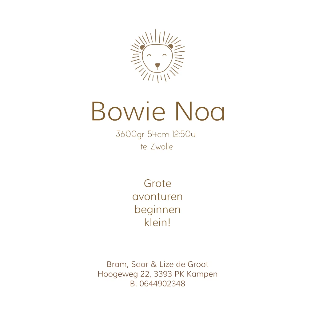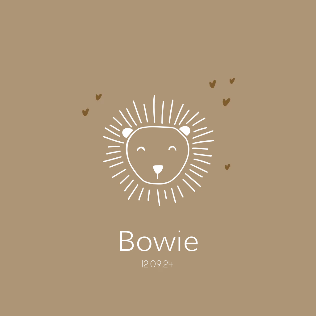 Dit is een stoer kaartje voor de geboorte van jullie dochter of zoon. Het kaartje heeft een bruine achtergrond. Centraal op het kaartje staat een goudfolie leeuwenhoofd. Ook de naam en geboortedatum worden in goudfolie gedrukt. Wil je dit kaartje in het echt zien? Bestel dan snel een proefdruk!