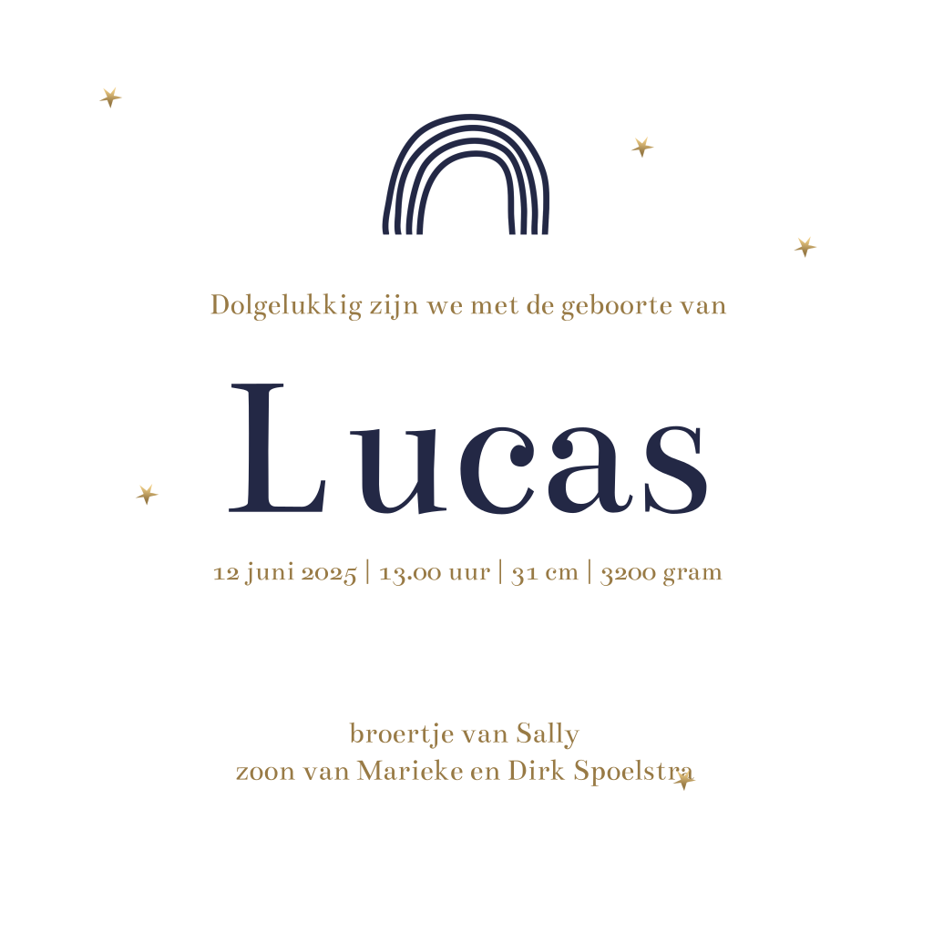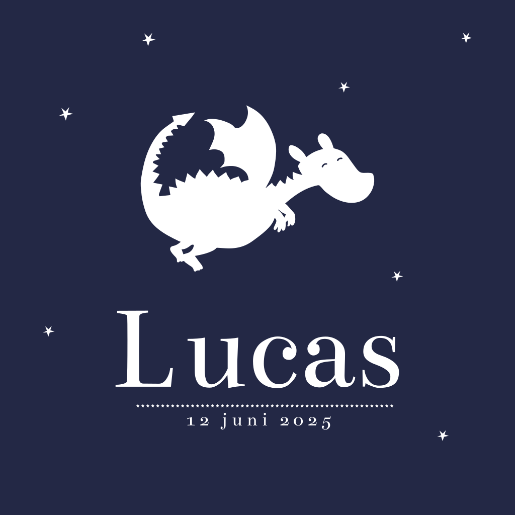 Stoer geboortekaartje met draakje in goudfolie. Ook leuk is dat de naam in goudfolie is en de sterretjes op de voor en achterzijde. Uniek geboortekaartje om elk familielid mee te verrassen.