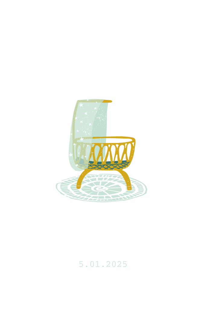 Dit is een hip kaartje voor jullie pasgeboren zoontje. Centraal op het kaartje staat de illustratie van een wiegje met groene details. Het sterrenbeeld wordt gedrukt in goudfolie, net als de naam van jullie kleintje. Bestel snel een proefdruk om dit kaartje in het echt te bewonderen!