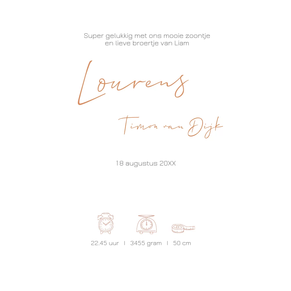 Dit is een luxe geboortekaartje voor jullie zoon. Centraal op het kaartje staat de lijntekening van een baby. De hoogglans opdruk geeft dit kaartje een luxe uitstraling. Pas het kaartje naar wens aan in onze online editor en bestel snel een proefdruk om dit kaartje in het echt te zien!